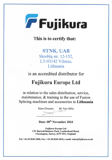 In 90% of cases, equipment repairs are completed within one day at the Fujikura authorized service center located at Skroblų St. 12-152, LT-03142 Vilnius. If necessary, we provide replacement equipment during longer repair periods.